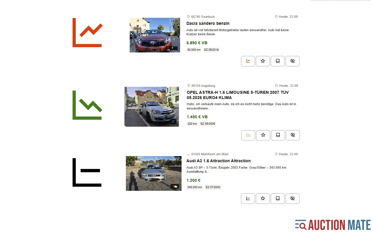 AuctionMate ist eine Browser-Erweiterung, die Preise verfolgt, über Änderungen informiert und deine Beobachtungslisten über verschiedene Marktplätze hinweg übersichtlich hält.